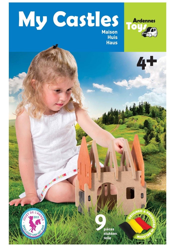 Maison d’Ardennes Toys. Cette petite maison si charmante et facile à construire, notamment appréciée par les petites filles, est idéale comme premier achat pour se faire la main. Les pièces s’assemblent sans clous ni vis. La partie « village » de la collection My Castles est bien représentée avec cet ensemble de 9 pièces en bois tout charmant qui complètera à merveille la gamme des châteaux. Designé et fabriqué en Belgique.