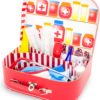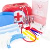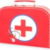 Mallette en carton comprenant : 1 carnet de soin, 1 stéthoscope (fonctionnel), 2 masques à élastiques GM (bleu), 2 masques à élastiques PM (blanc), 2 calots de chirurgien, 2 charlottes, 1 paire de gants en latex, 2 abaisses langue en plastique jaune, 1 thermomètre (factice), 1 pince anatomique bleue, 1 sachet de coton, 1 rouleau de « sparadrap », 1 bande extensible (rouleau), 4 pansements colorés, 2 seringues (10 ml et 20 ml.