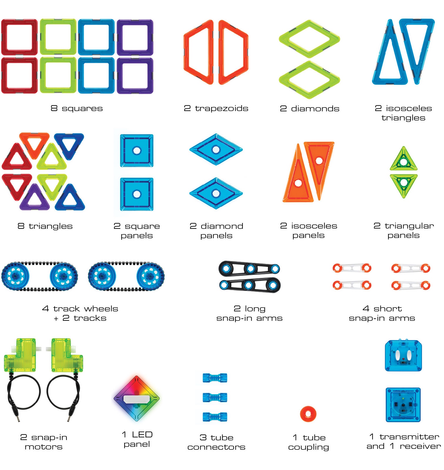 Contenu : 51 pièces colorées dont 8 carrés (6,5 x 6,5 cm), 8 triangles, 2 trapèzes, 2 losanges, 2 triangles isocèles, 2 panneaux triangulaires, 2 panneaux en forme de losange, 2 panneaux carrés, 2 panneaux triangulaires isocèles, 1 pièce lumineuse LED 6 couleurs, 2 chenilles, 4 roues pour chenilles, 3 pièces de châssis, 1 cylindre de montage, 4 attaches courtes, 2 attaches longues, 2 moteurs avec attaches, 1 télécommande avec un récepteur pour 3 fréquences.