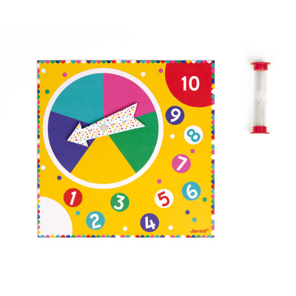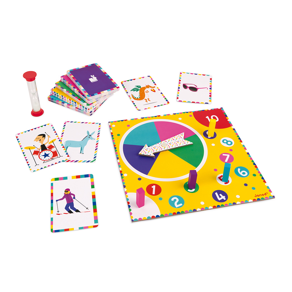 Contenu : 120 cartes à thèmes (7 x 10,5 cm) (24 cartes jaunes animaux, 24 cartes roses métiers, 24 cartes vertes objets, 24 cartes violettes sports, 24 cartes bleues « surprise », un plateau de jeu (23 x 23 cm), un sablier de 30 secondes, quatres pions (1 par équipe). Règles du jeu en français, anglais, allemand, néerlandais, espagnol et italien.