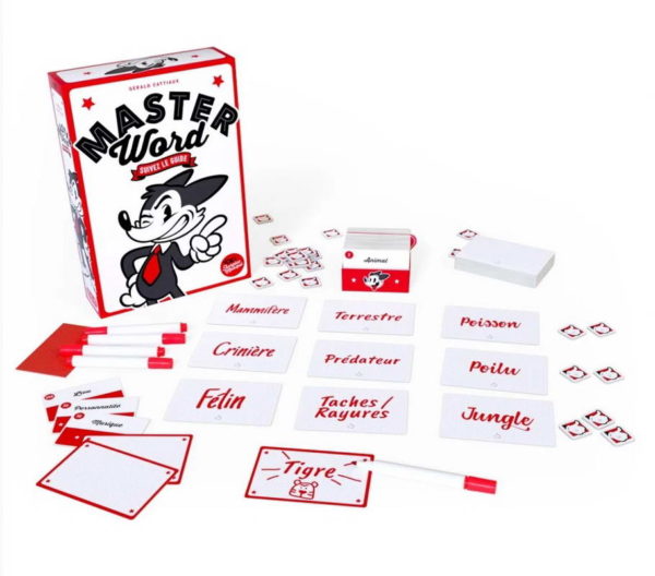 Contenu : 150 cartes Maître-mot (300 mots à trouver), 1 sabot, 30 cartes Piste, 3 cartes Solution, 5 feutres, 1 chiffon, 1 séparateur, 24 jetons, 1 feuillet de règles.