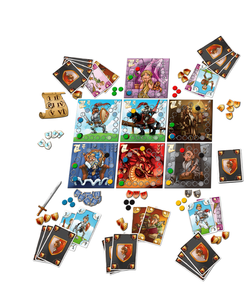 Contenu : 7 plateaux Entraînement, 52 cartes Apprentissage, 50 pions en bois, 1 parchemin compte-tours, 1 pion sablier, 1 pion Excalibur, des blasons, 1 carte Challenge, 1 coupe, 1 carte Études, 2 pions « rouleaux de parchemins », 1 carte « Ordre du tour », 1 règle de jeu.