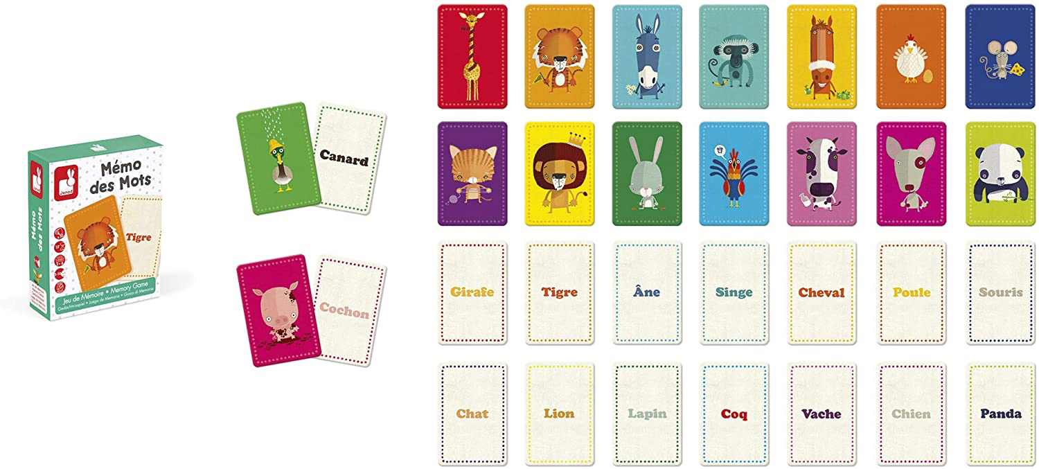 Mémo des Mots de Janod. Un jeu de mémoire, ou Il faut être le premier à reconstituer les paires avec les illustrations d’animaux et les noms associés.