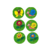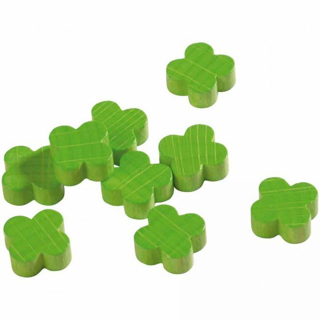 Contient : 1 dé en bois, 9 pions feuilles de trèfle en bois, 9 cartes rondes des amis du jardin, 1 règle du jeu.