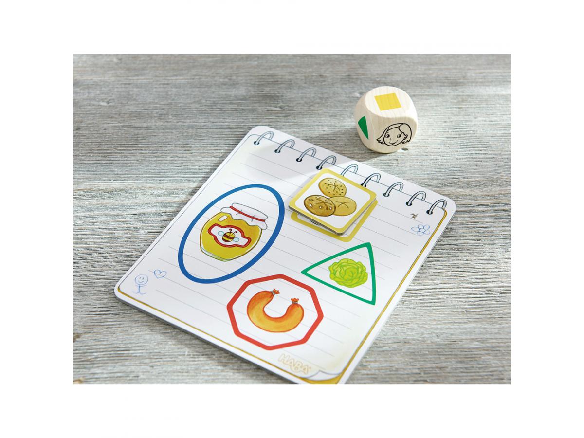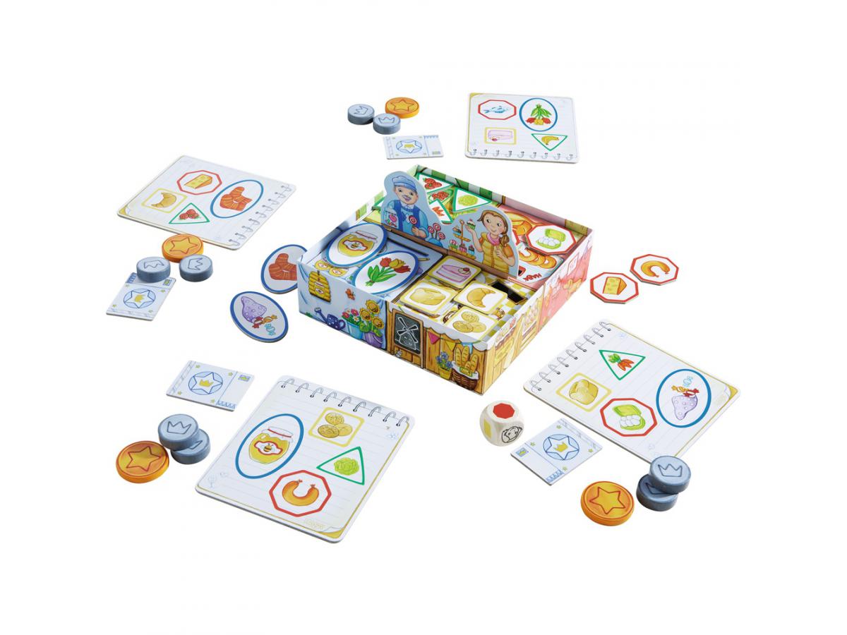 Contenu de la boîte : 1 étal (= fond de la boîte avec partie à insérer, plateau de jeu et décor vertical à emboîter), 8 petites pièces avec une couronne, 4 grosses pièces avec une étoile, 4 billets HABA, 16 plaquettes de produits (dans 4 catégories), 4 listes de courses, 1 dé, 1 règle du jeu.