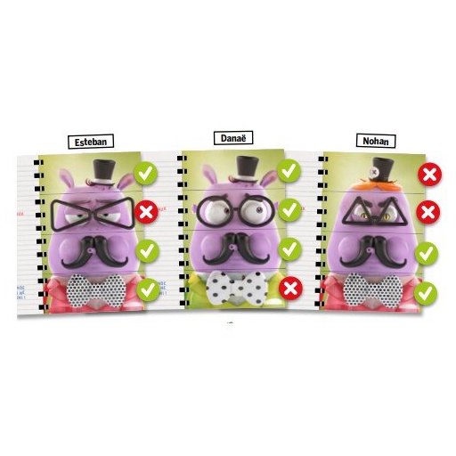 On fait défiler les accessoires des fripouilles. Chacun de ceux-ci apparaît 2 fois, sauf celui de la fripouille que l’on cherche, qui ne défile qu’une seule fois. Chaque joueur doit l’identifier dans son petit carnet. Celui qui trouve le plus grand nombre d’accessoire de la fripouille remporte la partie !