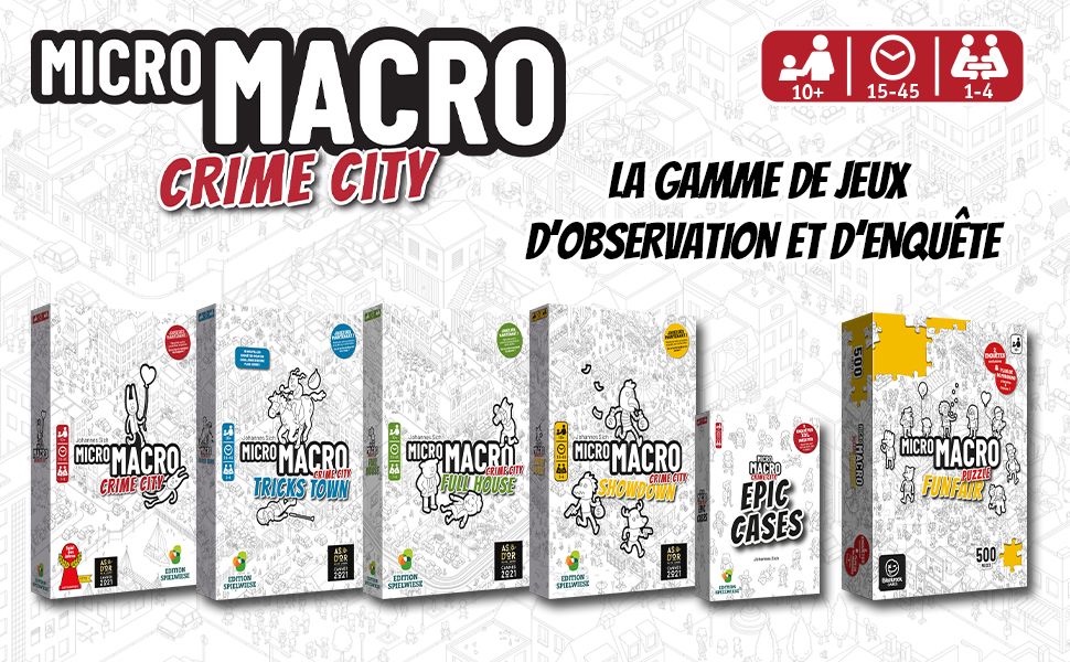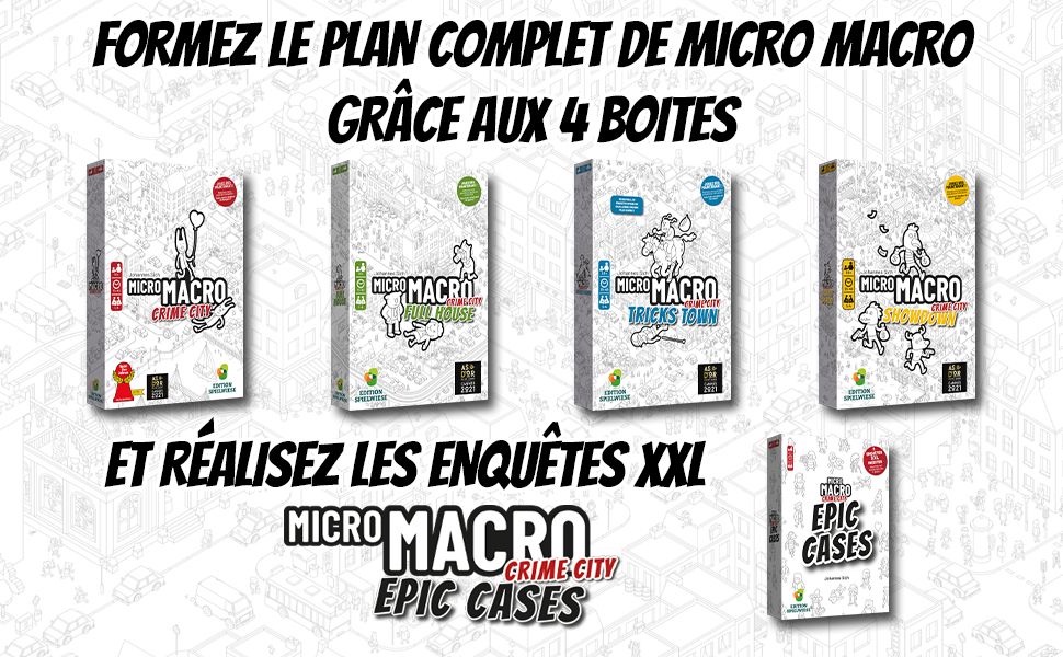 Avec le jeu d’enquête Epic Cases vous êtes de retour à Crime City. Après vos précédents succès, où vous avez résolu de nombreux mystères et mis de nombreux criminels sous les verrous, de nouveaux défis vous attendent. Des affaires non résolues qui demeurent, et il vous faudra à nouveau arpenter les rues de cette métropole gangrenée par la criminalité pour percer les derniers mystères. Plongez dans trois enquêtes épiques, réparties sur plusieurs chapitres, vous permettant d’explorer les quatre cartes de la gamme Micro Macro Crime City. Vivez une expérience inédite avec des enquêtes XXL. MicroMacro est un jeu coopératif. Un œil affûté et un sens de la déduction aiguisé seront vos meilleurs atouts pour coincer les criminels les plus retors !