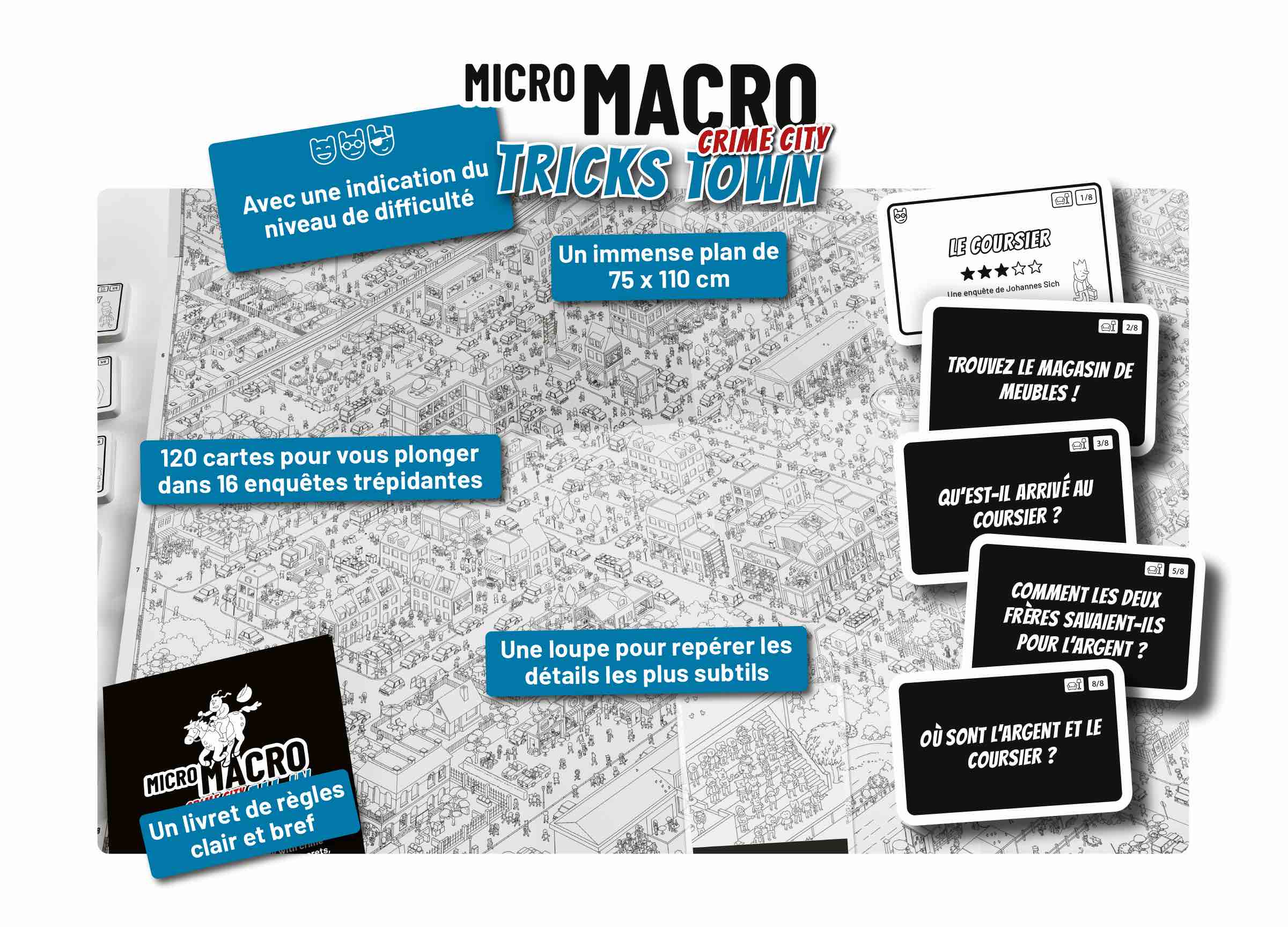 Tricks Town est le troisième volet de la série MicroMacro. Venez y découvrir une nouvelle partie de la ville, avec ses 16 enquêtes inédites et plus corsées à mener. Ce jeu est indépendant des premiers volets : il n‘est pas nécessaire de posséder ou d‘avoir joué aux épisodes précédents pour vous lancer dans ces nouvelles affaires ! MicroMacro est un jeu coopératif. Un œil affûté et un sens de la déduction aiguisé seront vos meilleurs atouts pour coincer les criminels les plus retors ! Les joueurs incarnent des détectives qui devront résoudre des affaires criminelles en observant le plan de la ville. Ils choisissent une enquête et retournent la première carte qui détaille l’affaire. Prenez ensuite la carte suivante et répondez à la question indiquée. Pour vérifier votre affirmation retournez la carte, la réponse est au dos ! Continuez de répondre aux questions afin de résoudre l’enquête.