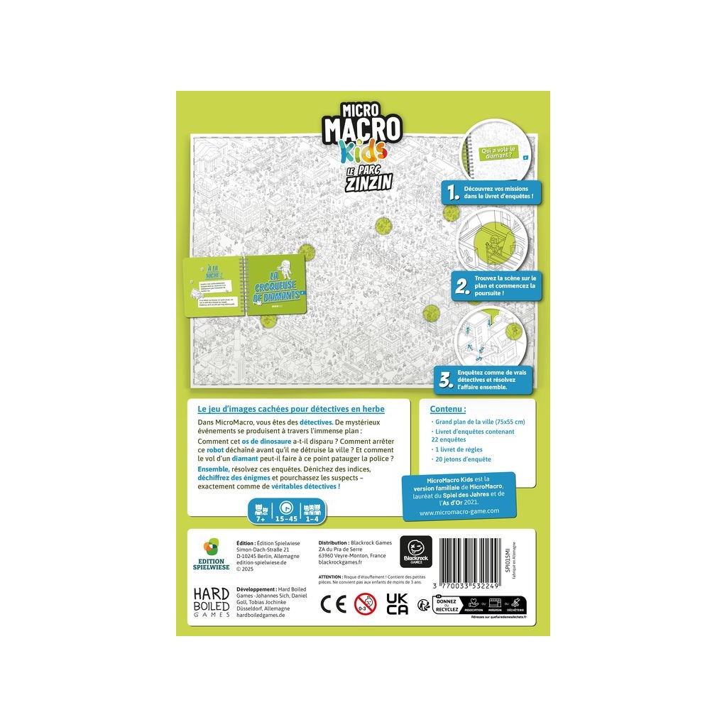 Micro Macro Kids, déduction et exploration urbaine. Venez y découvrir un nouveau plan de ville, avec ses 22 enquêtes inédites et non-violente. Ce jeu est indépendant des boites précédentes : il n‘est pas nécessaire de posséder ou d‘avoir joué aux épisodes précédents pour vous lancer dans ces affaires !