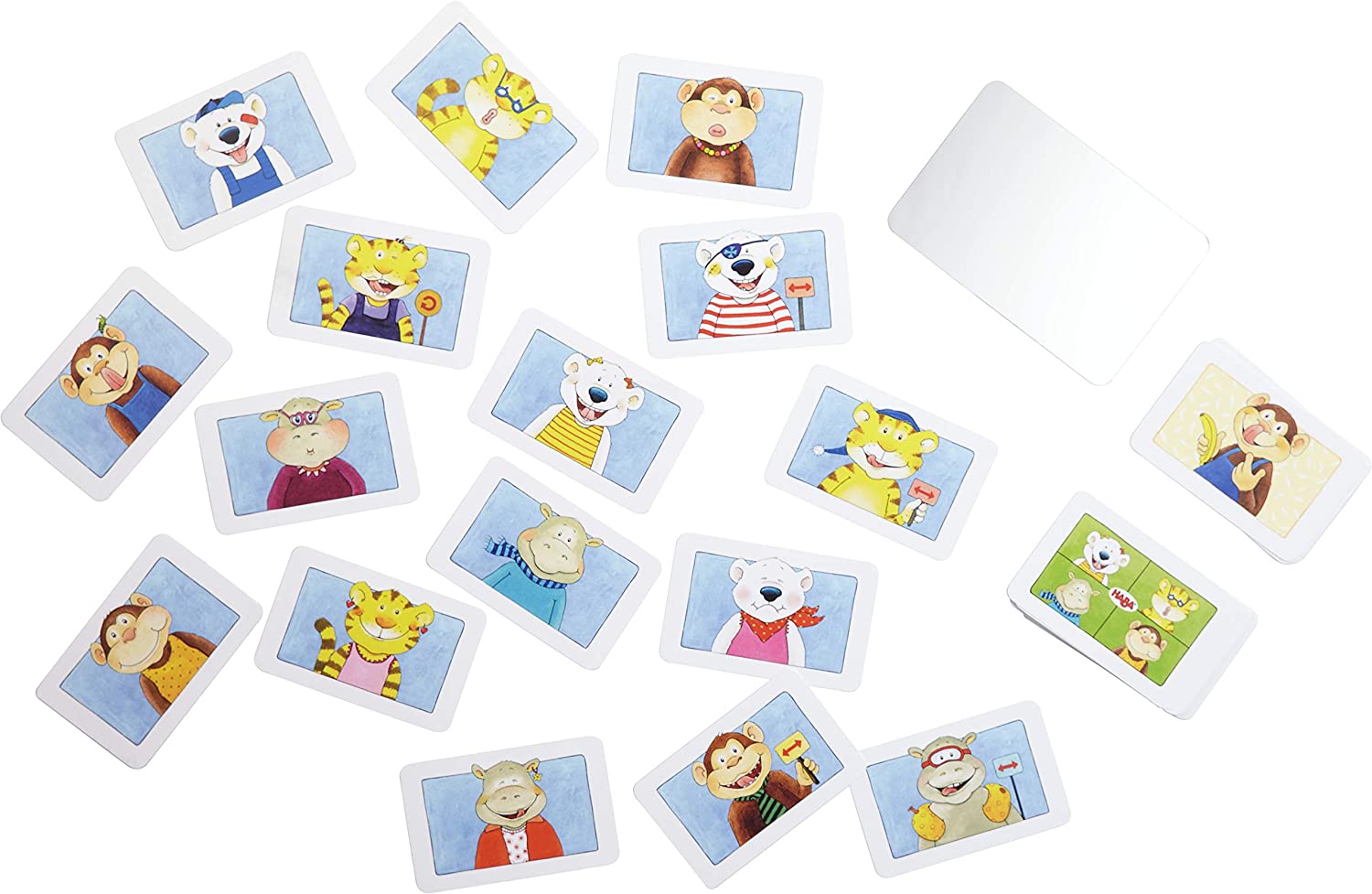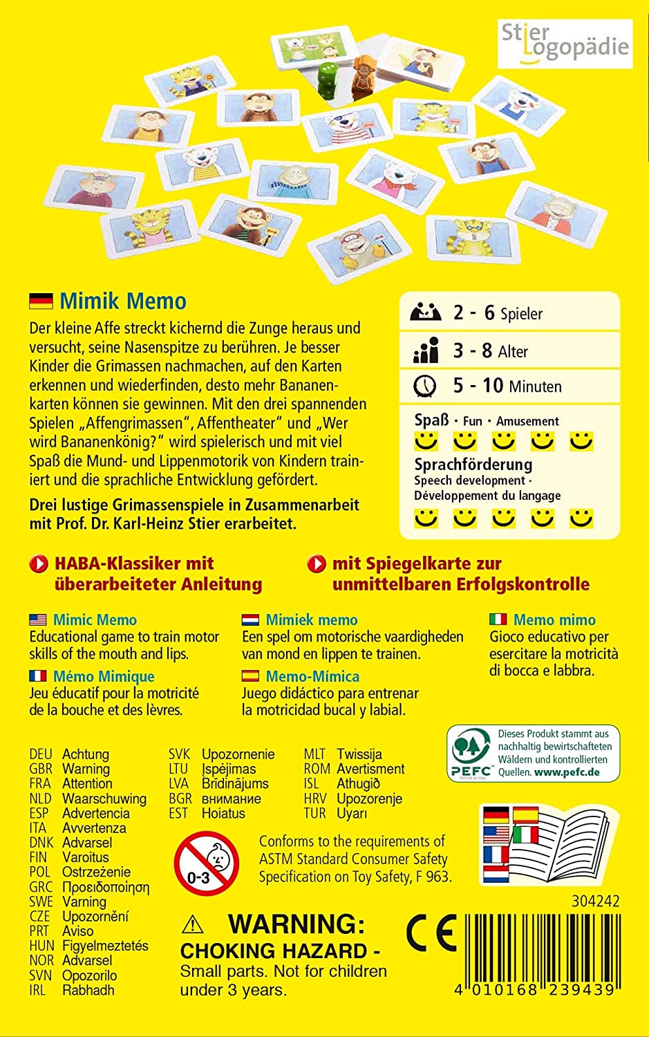 Plus les joueurs imitent de grimaces, les reconnaissent sur les cartes et les retrouvent, plus ils gagnent de cartes de banane. Avec trois jeux passionnants « Grimaces de singe », « Singeries » et « Qui sera le roi de la banane ? », les enfants exercent de manière ludique la motricité de la bouche et des lèvres tout en s’amusant énormément, ce qui favorise le développement du langage.