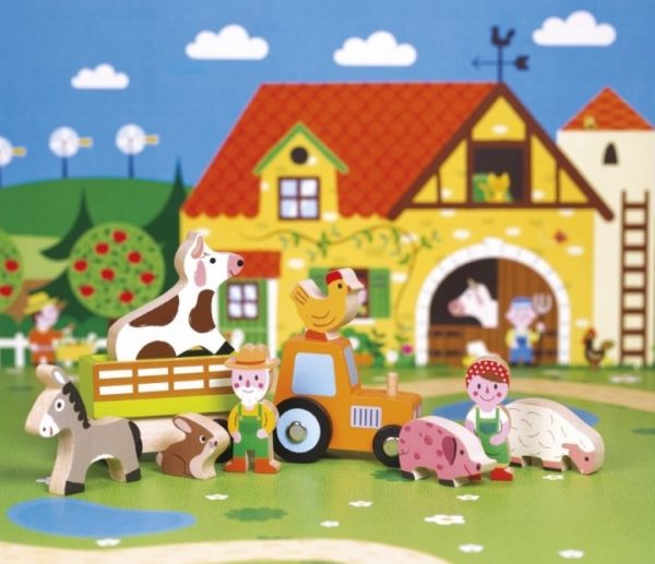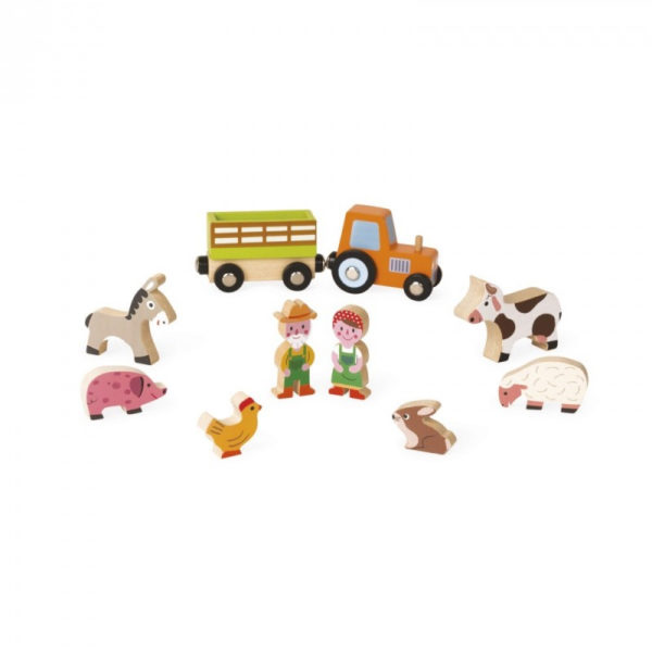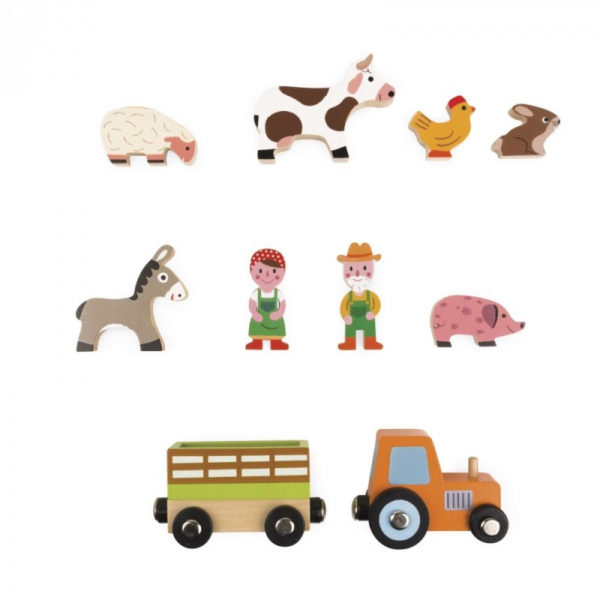 Contenu : 1 fermier, 1 fermière, 1 poule, 1 lapin, 1 cochon, 1 mouton, 1 âne, 1 vache, 1 tracteur, 1 remorque.