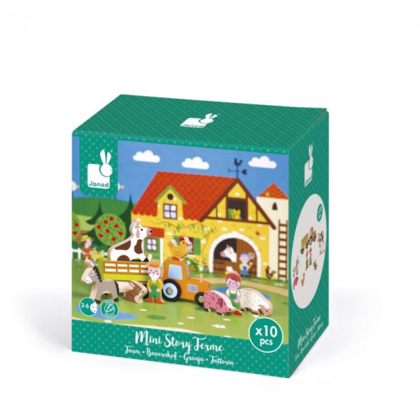 Il était une fois, à la campagne la plus belle des fermes …  Avec Mini Story Ferme et ses 10 pièces de Janod ! Créez un superbe univers et invente les plus belles histoires avec les figurines miniatures. Tu pourras compléter ce coffret rempli de bonheur avec les autres boîtes de la Collection Mini Story.