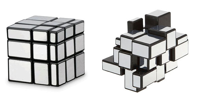Semblable au 3×3 classique, mais avec des faces de tailles différentes et de couleur argent pour l’effet miroir. Le cube est par conséquent polymorphe et on obtiendra des formes inconnues et surprenantes lors de son « mélange ».