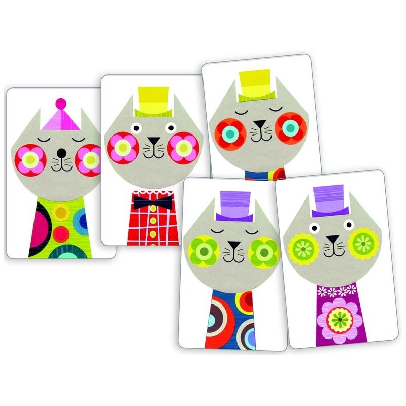 Mixamatou de Djeco. Un jeu d’association. Le même chapeau, les mêmes joues ou le même pull… 3 façons de combiner les chats entre eux et de se débarrasser de ses cartes pour gagner !