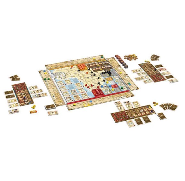 Contenu : 1 plateau de jeu, 4 pistes Compagnie (recto/verso), 4 plateaux individuels, 88 cartes, 86 tuiles, 60 pièces, 60 Comptoirs commerciaux, 45 marqueurs, 1 carnet de score, 4 aides de jeu, règle du jeu.