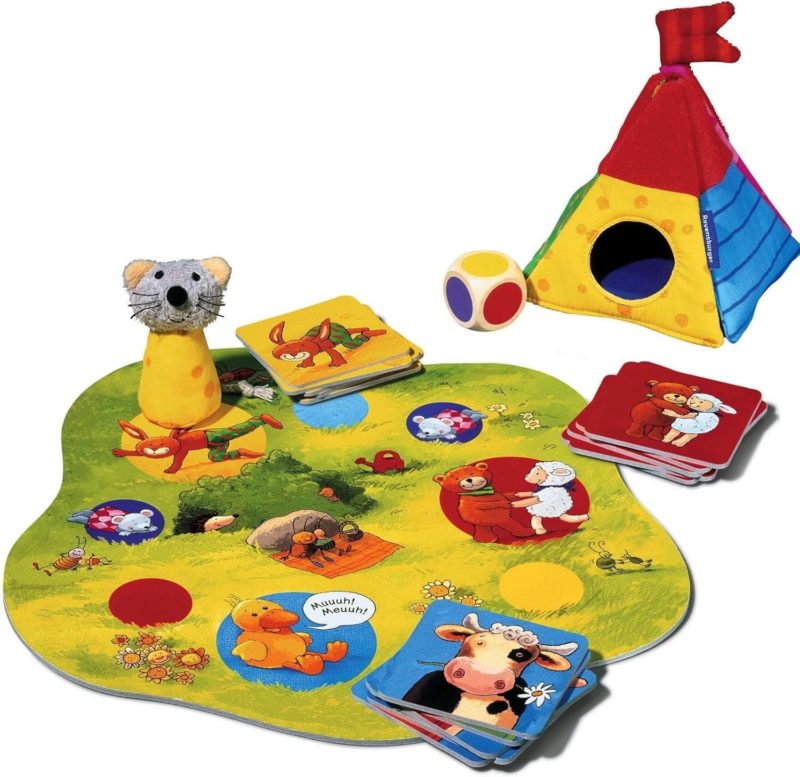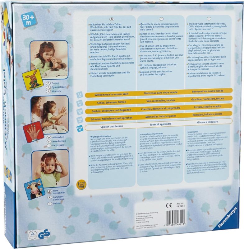 Avec le dé de couleur, les joueurs déplacent la petite souris en peluche sur le plateau de jeu. Des cartes de couleur indiquent des tâches amusantes et variées : imiter des animaux, tourner en rond, faire des grimaces pour gagner une nouvelle pièce pour la tente. Tous les enfants jouent ensemble jusqu’à ce que la tente puisse enfin être montée !