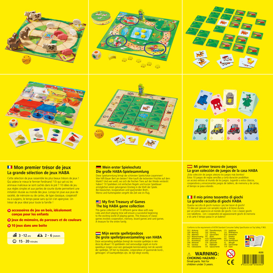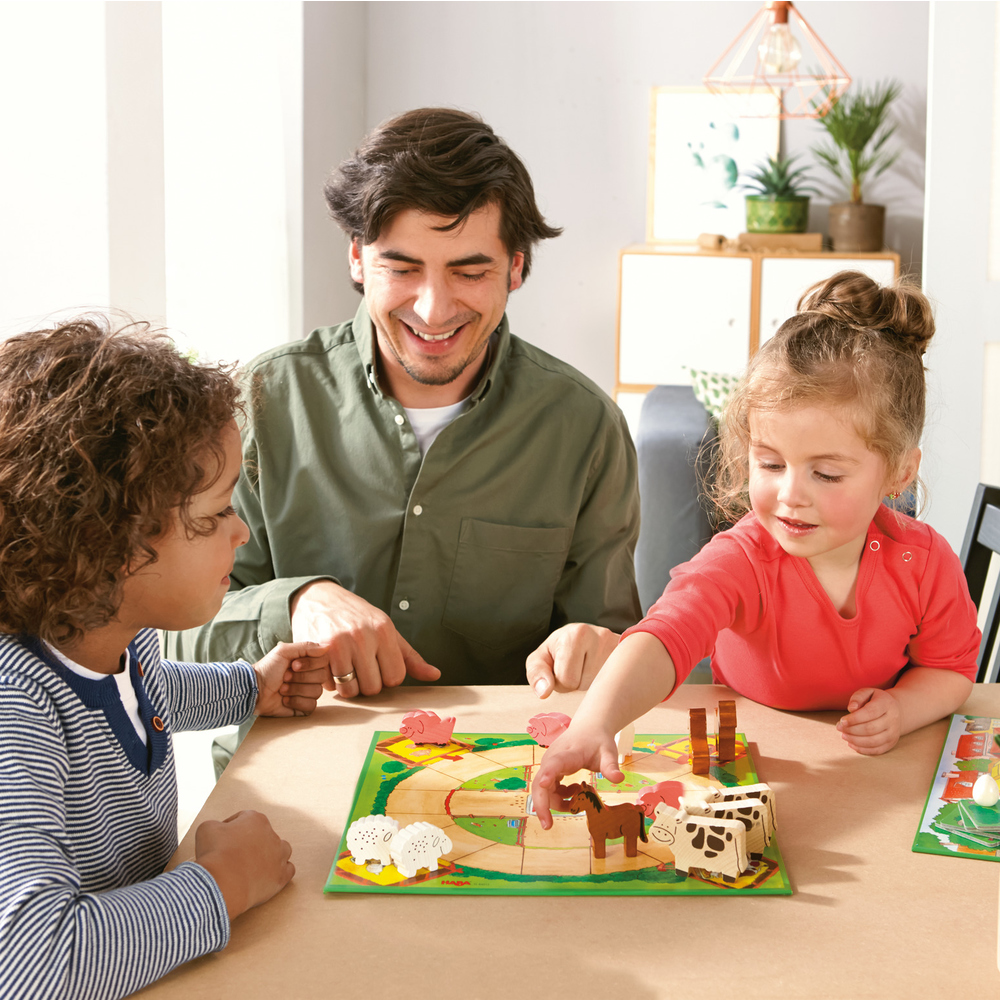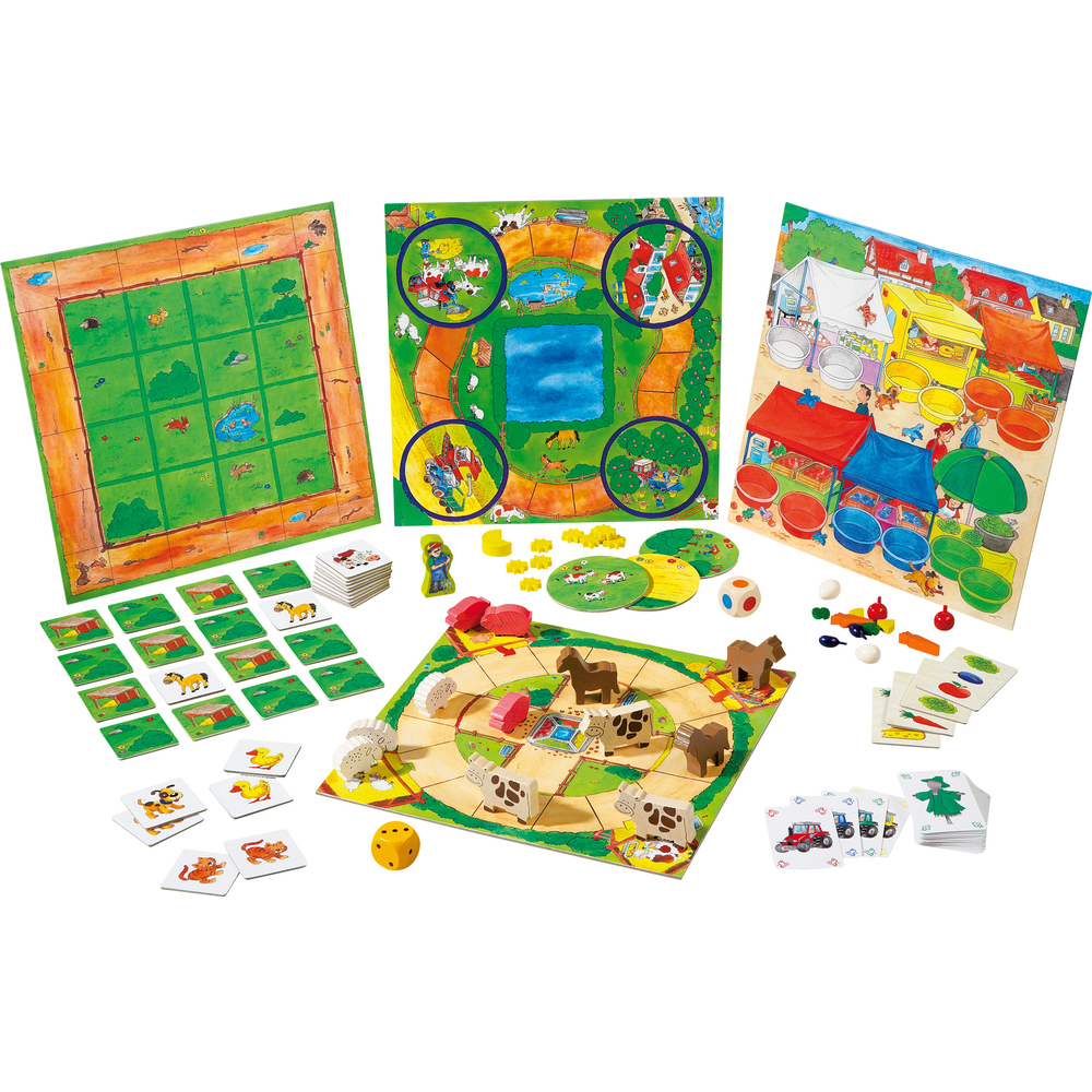 3 chevaux, 3 vaches, 3 cochons, 3 moutons, 2 pommes rouges, 2 prunes, 2 œufs, 2 portions de fromage, 2 feuilles de salade, 2 carottes, 1 fermier, 1 dé, 1 dé multicolore, 9 étoiles, 1 lune, 1 règle du jeu.