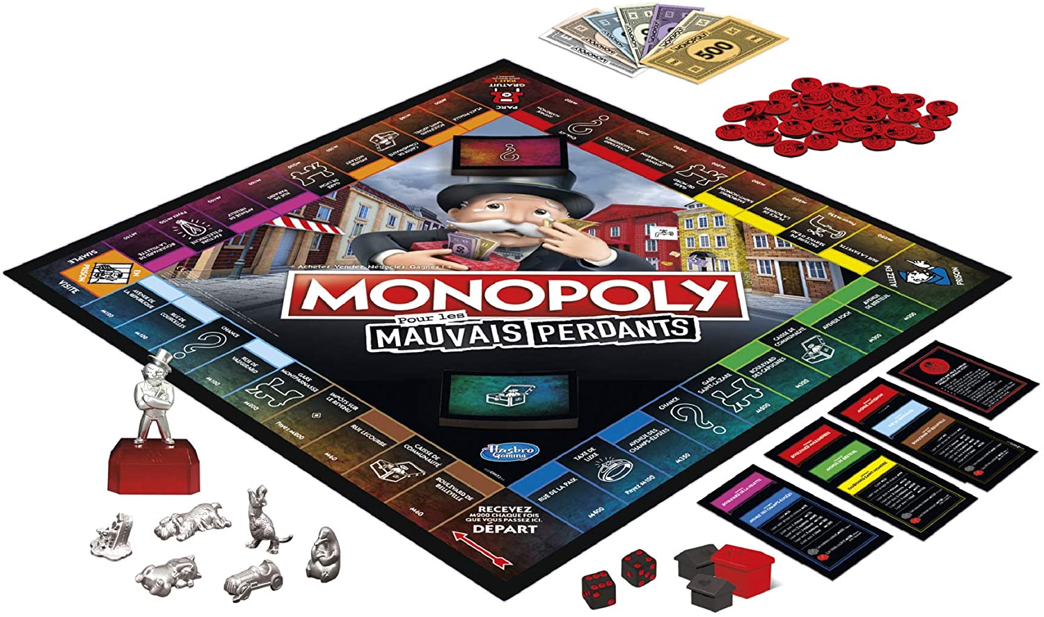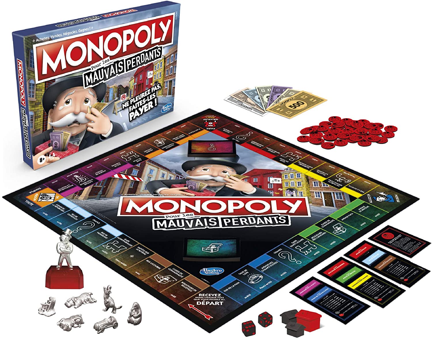 Inclus : monnaie mauvais perdants, nouvelles cartes Chance et Caisse de Communauté, nouveaux pions mauvais perdants, 6 pions dont 1 pion géant Monopoly. Mauvais perdant qui permet d’obtenir des avantages dans le jeu, 1 plateau de jeu, 2 dés et les règles du jeu en français. De 2 à 6 joueurs.