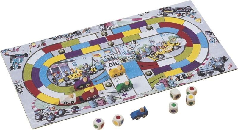 Contenu : 6 voitures de course, 6 dés multicolores, 1 plateau de jeu, 1 règle du jeu en français, allemand, anglais, espagnol, néerlandais, danois, finnois, portugais.