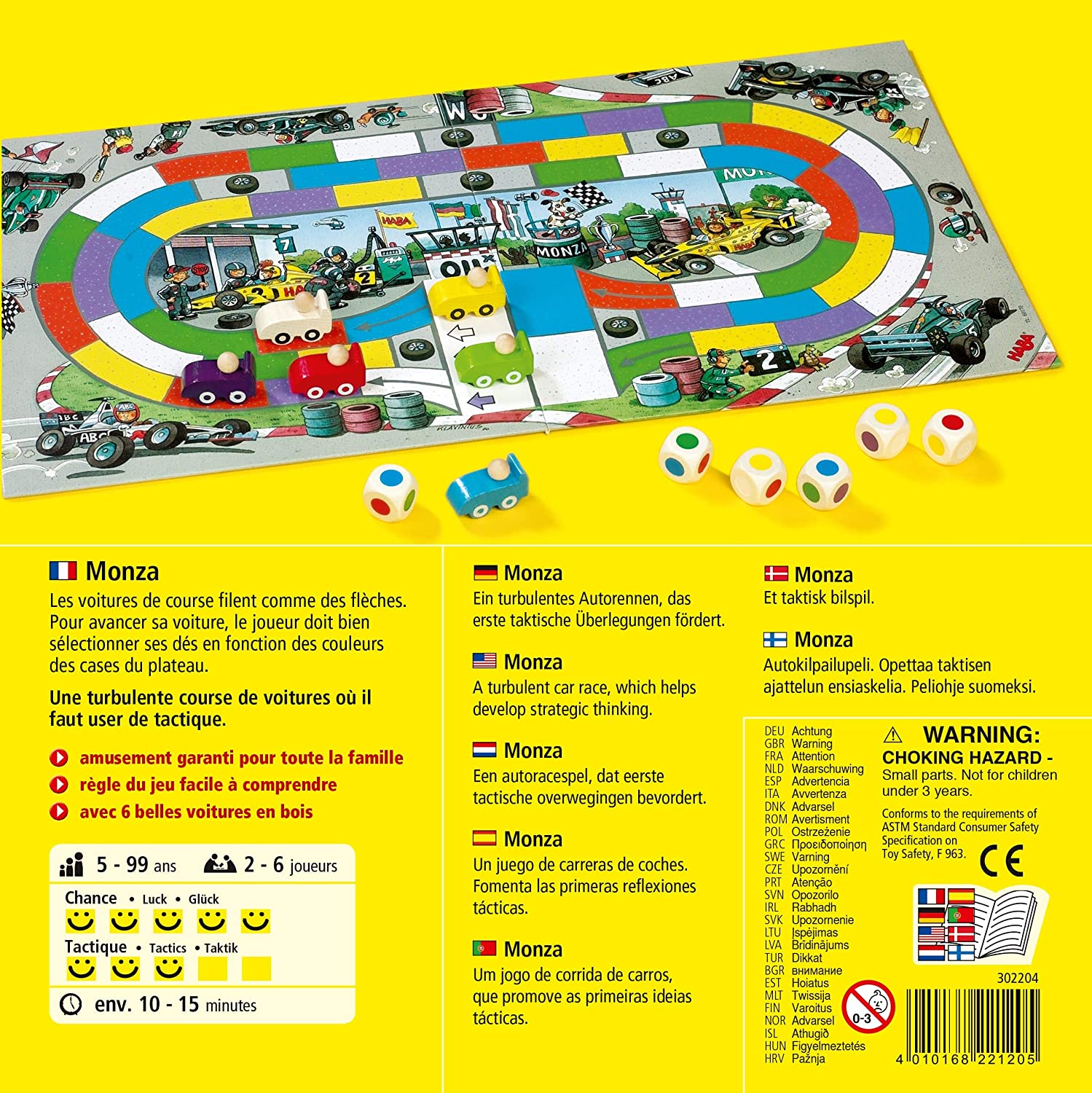 Six voitures de course sont prêtes à prendre le départ sur le circuit de Monza ! Les couleurs des dés correspondent aux couleurs des cases. Pour avancer sa voiture sur la piste, le joueur lance les 6 dés en même temps et observe bien les couleurs obtenues. Sa voiture ne peut avancer que si les dés indiquent les mêmes couleurs que les cases avoisinantes. Les cases pneu servent d’obstacles, aucune voiture ne peut y passer ou s’y arrêter. Les pilotes peuvent aussi faire reculer une autre voiture en arrivant sur une case déjà occupée par une autre voiture. Qui franchira en premier la ligne d’arrivée ?