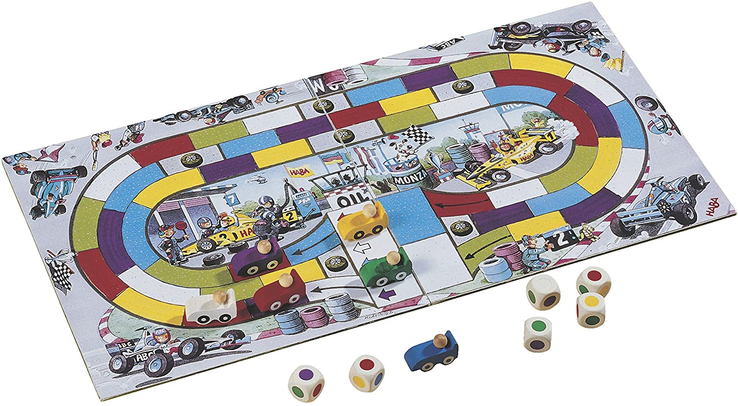 Contenu : 6 voitures de course, 6 dés multicolores, 1 plateau de jeu, 1 règle du jeu en français, allemand, anglais, espagnol, néerlandais, danois, finnois, portugais.