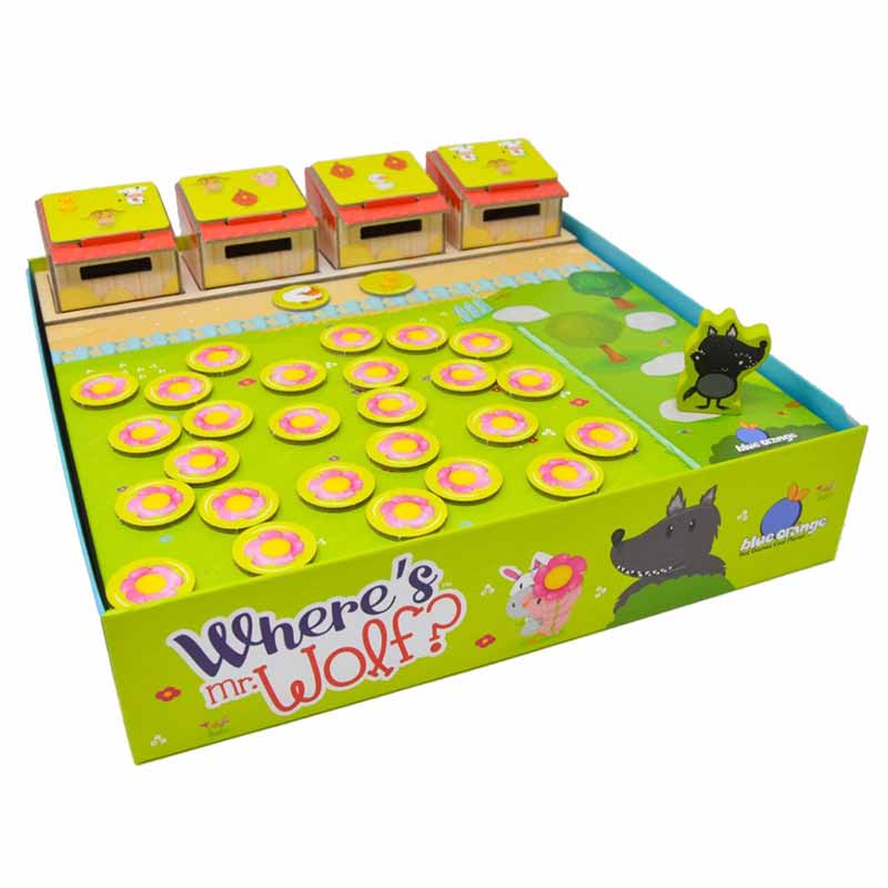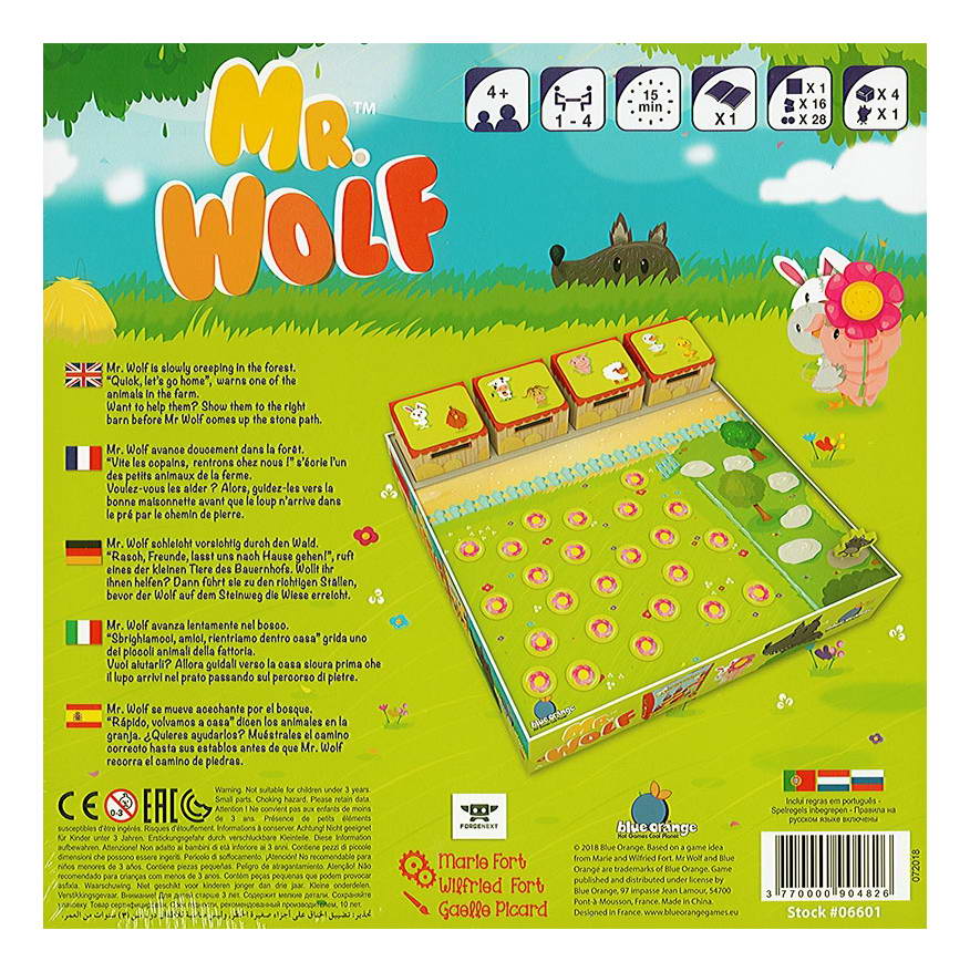 Mr. Wolf est un jeu de mémoire en mode coopératif accessible dès 4 ans. Vous devez tous ensemble ramener les 8 animaux dans leur maisonnette attitrée. Si tous les animaux indiqués sur chaque maisonnette sont bien à l’abri avant que Mr. Wolf n’arrive, vous remportez la partie ! Le jeu comporte deux niveaux de difficulté.