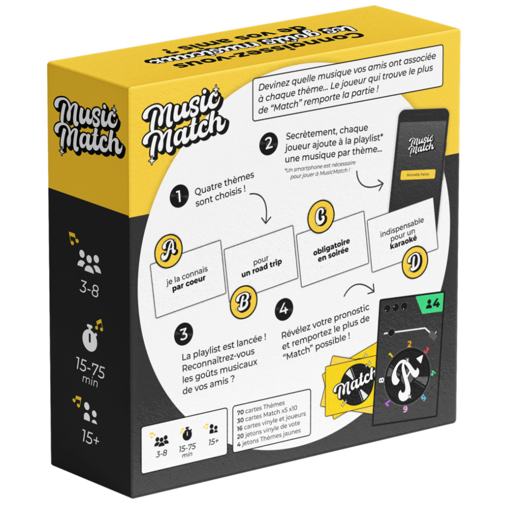 MusicMatch est le jeu d’ambiance musical où l’on associe des musiques à des moments de vie… puis où l’on tente de deviner les goûts des autres joueurs !