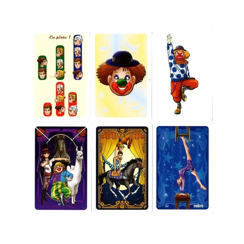 Contenu: 110 cartes (34 cartes Défis, 24 cartes Acrobate/Numéro, 26 cartes Affiche, 8 cartes Clown-statue, 17 cartes Clown, 1 carte Monsieur Loyal), règles.