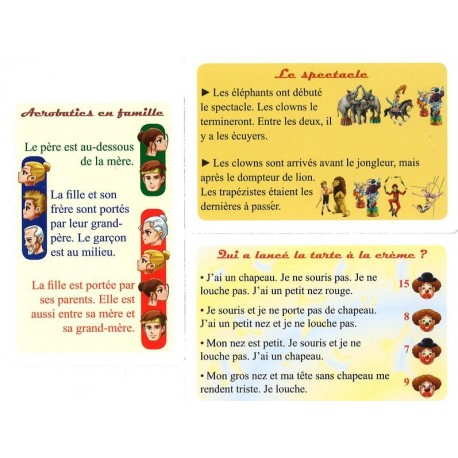 Jeu de cartes avec 10 règles alliant langage, logique, attention visuelle et rapidité. Au programme jeu d’attention visuelle pour retrouver un élément commun entre 2 affiches. Disposer des cartes dans le bon ordre (en-dessous, au-dessus, entre…). Trouver un clown selon une description. Mettre les numéros de cirque dans l’ordre chronologique. Faire reproduire la position d’un clown à un autre joueur en décrivant l’image. Un jeu riche en possibilités!