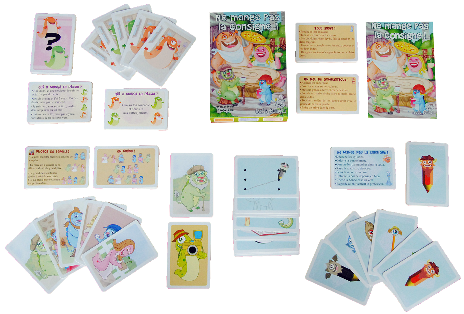 Ne mange pas la consigne ! est un jeu de cartes multi-compétences : langage, repères spatiaux, rigueur, logique, attention visuelle et auditive, motricité, créativité. Six jeux indépendants pour développer votre concentration, votre rigueur et votre écoute !