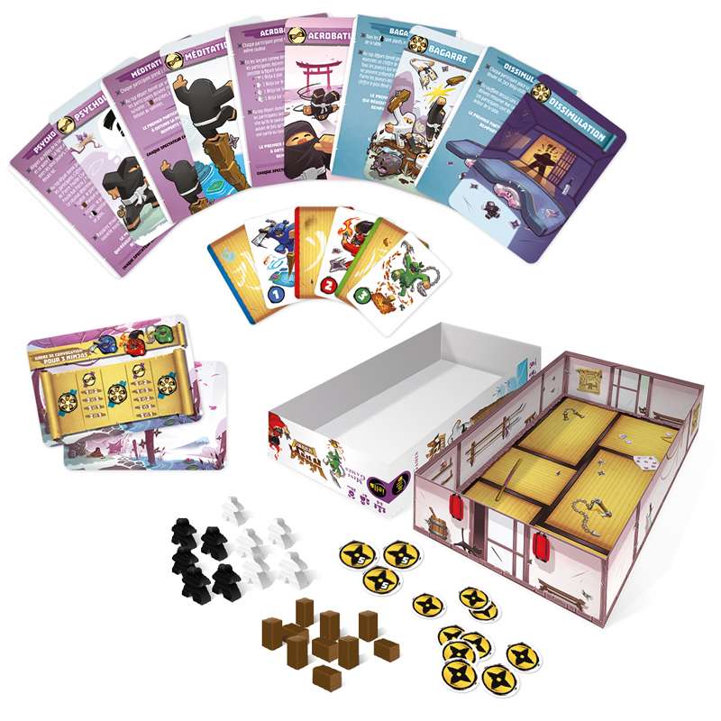 Avec les pions Ninjas, rondins et tatamis, les épreuves se succèdent à un rythme effréné. Infiltration, détection, acrobatie ou psychologie demandent dextérité, bluff et précision. Les joueurs devront ainsi être capables d’empiler des Ninjas, de les lancer, de les rattraper au vol… voire de deviner combien sont dissimulés dans la boîte rien qu’en la secouant.