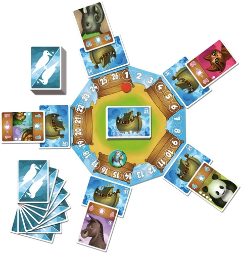 Contenu : 1 plateau à assembler, 1 pion Noé, 5 pions score (1 couleur pour chaque  joueur), 55 cartes de dimensions 63mmx88mm dont 8 embarcations et 47 animaux.