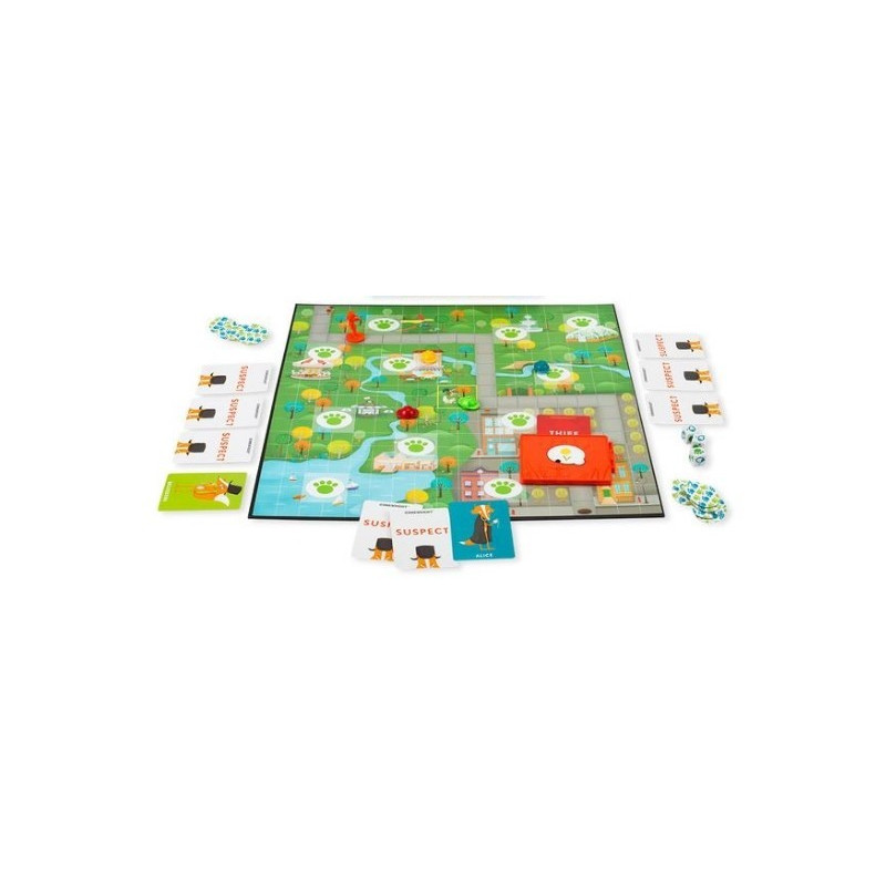 Contenu du jeu : 16 cartes avec des suspects, 3 dés, 16 cartes avec des voleurs, 1 figurine Renard, 12 plaquettes d’indice, 1 scanneur de renard, 4 figurines de détective, 1 plateau de jeu.