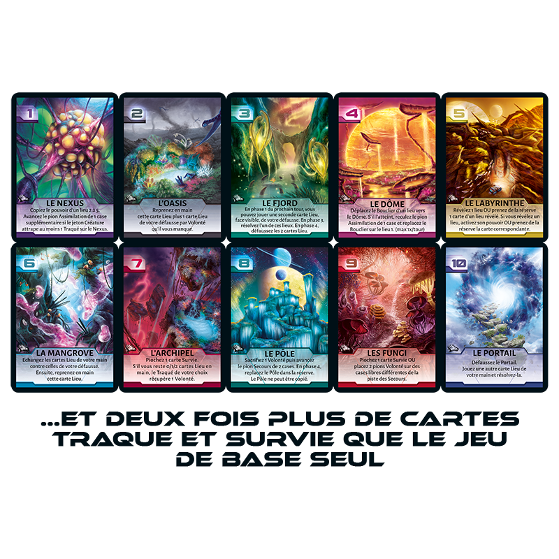 Découvez 10 nouveaux lieux en augmentant vos chances de survie face à l’impitoyable créature. Les cartes Lieu de l’extension Exploration peuvent être jouées ensemble ou combinées avec celles du jeu de base.