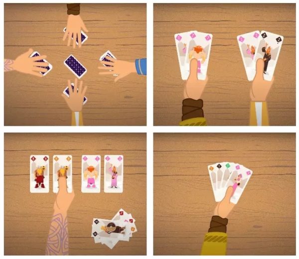 Réfléchissez cependant bien à votre pose ! En effet, à chaque fois que vous posez une ou plusieurs cartes, vous devez récupérer l’une des cartes posées par le joueur précédent, et défausser les autres : Rien ne vous garantit donc de pouvoir récupérer uniquement des cartes qui vous arrangent… À la fin de chaque manche, vous marquez autant de points que le nombre de cartes qu’il vous reste en main.