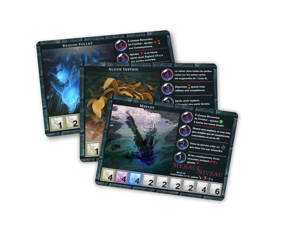 One Deck Dungeon Profondeurs Abyssales de nouveaux périls se dressent sur votre chemin, apportant un niveau supplémentaire de défi à vos aventures. Les terrifiants sbires vous attaqueront à chaque rencontre, testant vos compétences et votre ingéniosité face à de nouvelles difficultés.