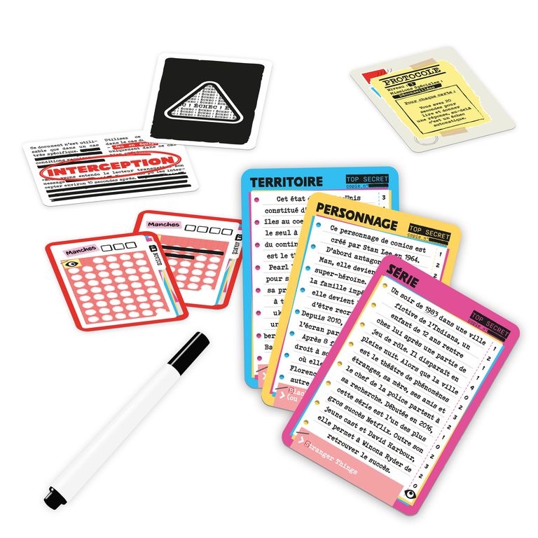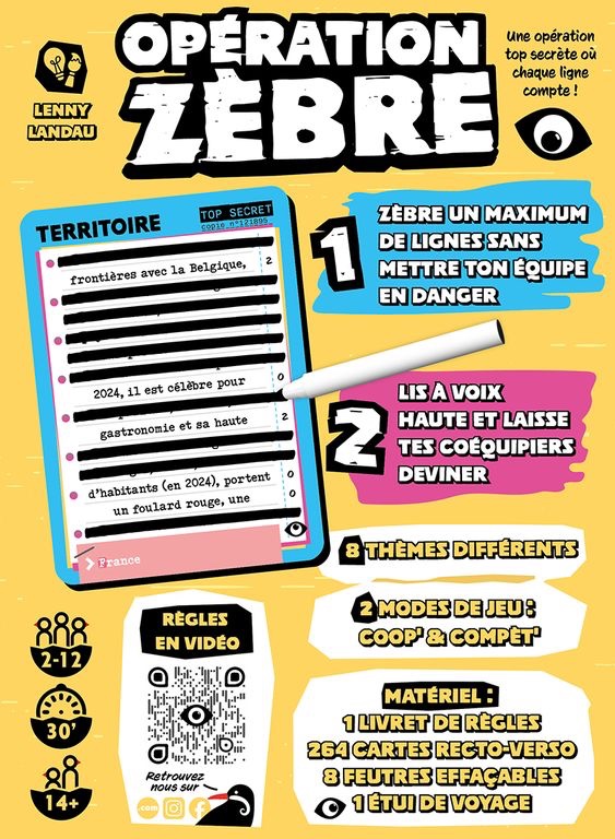 Essayez de faire deviner le contenu de votre document classifié en dissimulant certaines informations… mais en laissant suffisamment d’informations pour vos coéquipiers ! Rayer les éléments inutiles sur votre carte et lisez à haute voix ce qui reste. Le vrai défi consiste à trouver le juste milieu entre l’occultation d’informations et la préservation d’indices clairs pour mener votre équipe à la bonne réponse ! Opération Zèbre est un jeu de déduction qui se joue en mode compétitif ou coopératif. Décryptez, déduisez, triomphez !