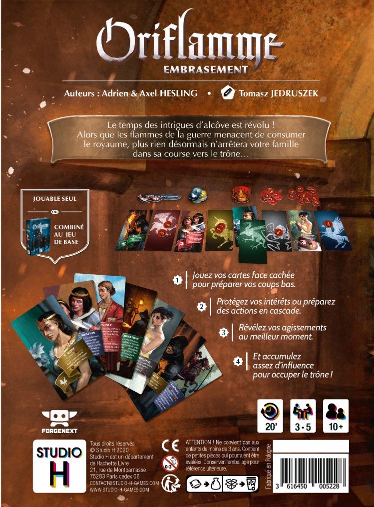 Oriflamme Embrasement est la suite – tant attendue – d’Oriflamme, As d’Or 2020 ! Oriflamme 2 peut se jouer seul, ou bien en complément du premier opus. Bluff et trahisons seront vos meilleures stratégies pour atteindre le trône et devenir le nouveau roi !