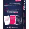 Le principe est très simple, installez-vous confortablement, piochez une carte et ayez une délicieuse conversation avec votre moitié, du type : – Préfères-tu parler toutes les langues du monde ou pouvoir parler aux animaux ? Pourquoi ? – Comment me présenterais-tu en 5 mots à tes amis ? – Si on devait faire une mission humanitaire ensemble, que ferions-nous ? 180 conversations répartie en 5 catégories de discussions : Révélations sur soi, Complicité, Nos Projets, Olé Olé et Défis.