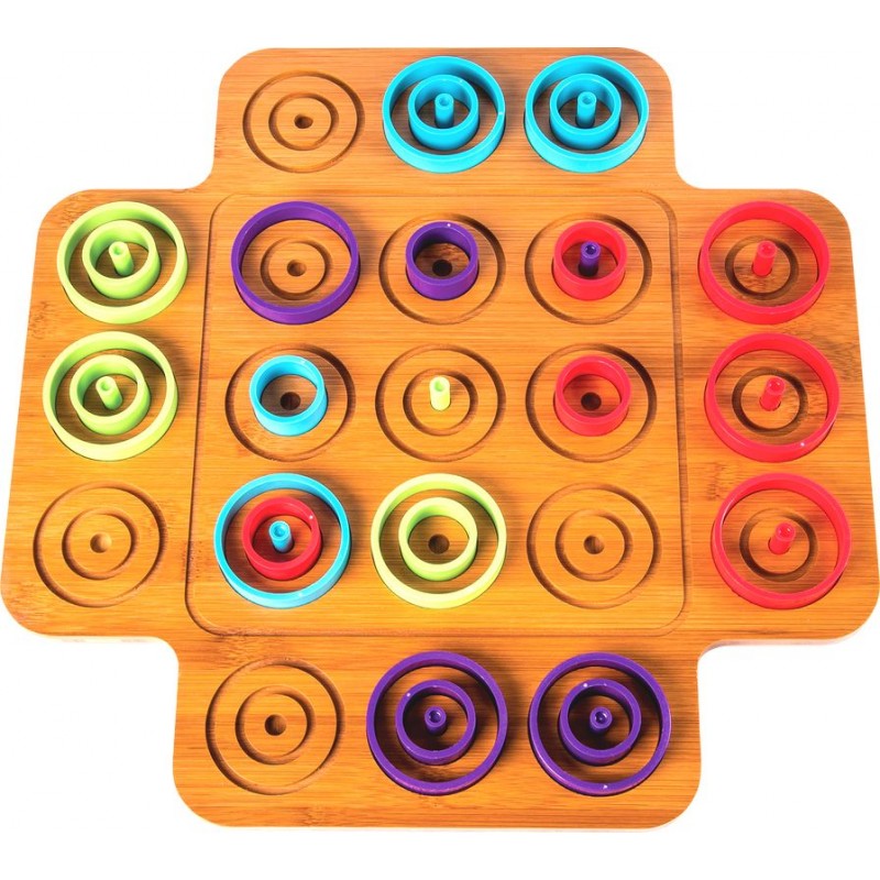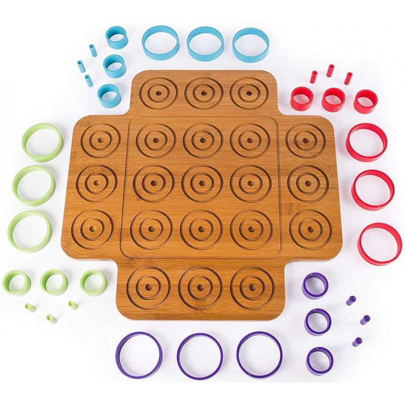 Contenu: 1 grand plateau en bambou (36,3 x 36,3 cm), 36 anneaux en plastique en 3 tailles (diam. du plus grand 5,5 cm) et 4 couleurs, règle et variante.