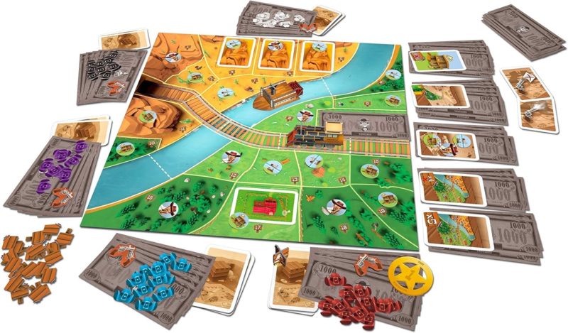 Contenu : 1 plateau de jeu, 110 billets, 50 jetons Chapeau, 5 jetons Duel, 19 jetons Parcelle, 19 jetons Bonus, 10 cartes Objectif Secret, 10 cartes Objectif Commun, 5 cartes Mine, 3 cartes Ranch, 2 cartes Pistolet Duel, 1 jeton Premier Joueur, 1 Locomotive, 1 Bateau, 1 pion Enchère en cours. Règles du jeu.