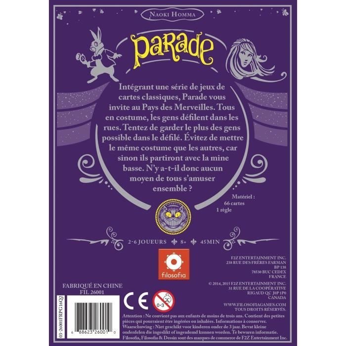 Ça bouge au sein de la parade… Soyez tactique pour emporter la victoire ! Parade est un jeu de plis familial, original et élégant. Simple à comprendre et rapide à jouer ce jeu de cartes comprend également une part de réflexion. Le tout dans l’univers d’Alice au Pays des Merveilles.