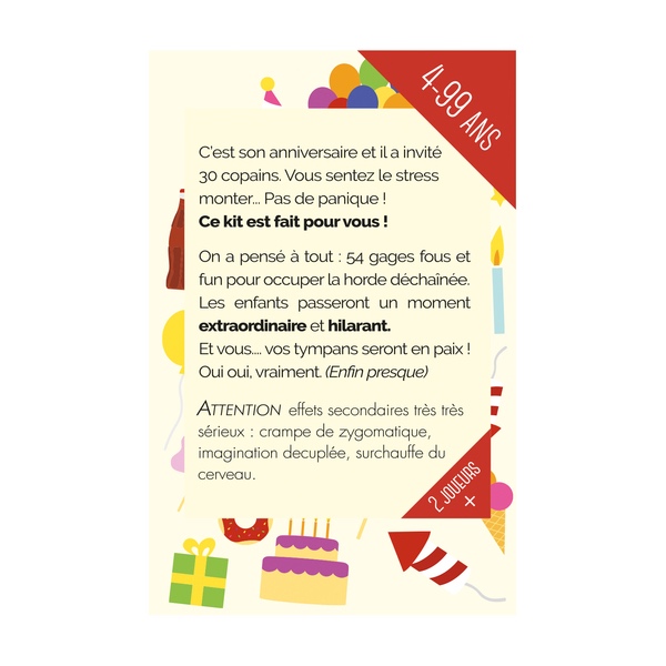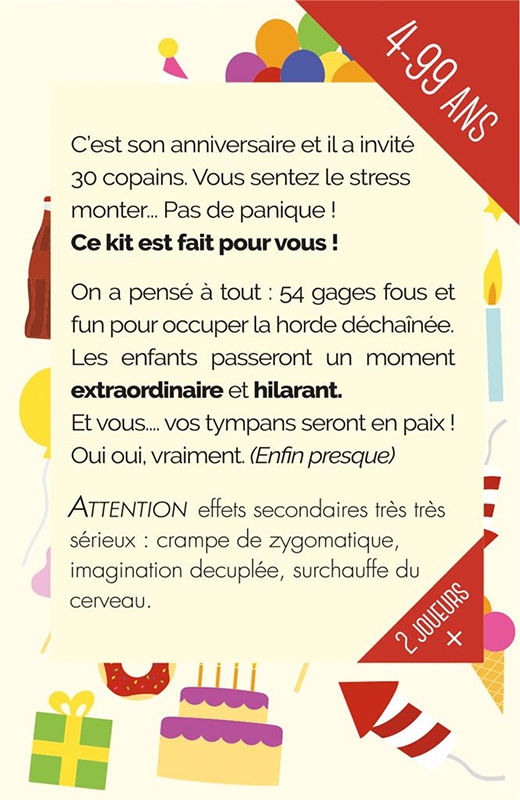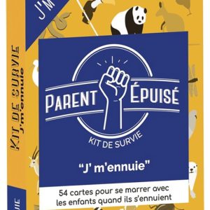 le kit de survie anniversaire contient 54 gages pour animer la fête et le kit de survie « je m’ennuie » propose 54 cartes pour se marrer avec les enfants quand ils s’ennuient.