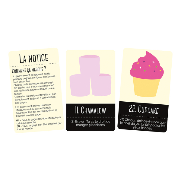 Le concept est simple et très efficace : à chaque carte correspond 1 gage à réaliser. Par exemple, si l’enfant tire la carte « fusée », il doit raconter l’histoire du 1er vol spatial d’un petit pois. Les 54 cartes de chaque Kit sont la promesse de moments de partage entre enfants et parents… et d’une certaine tranquillité pour ces derniers !