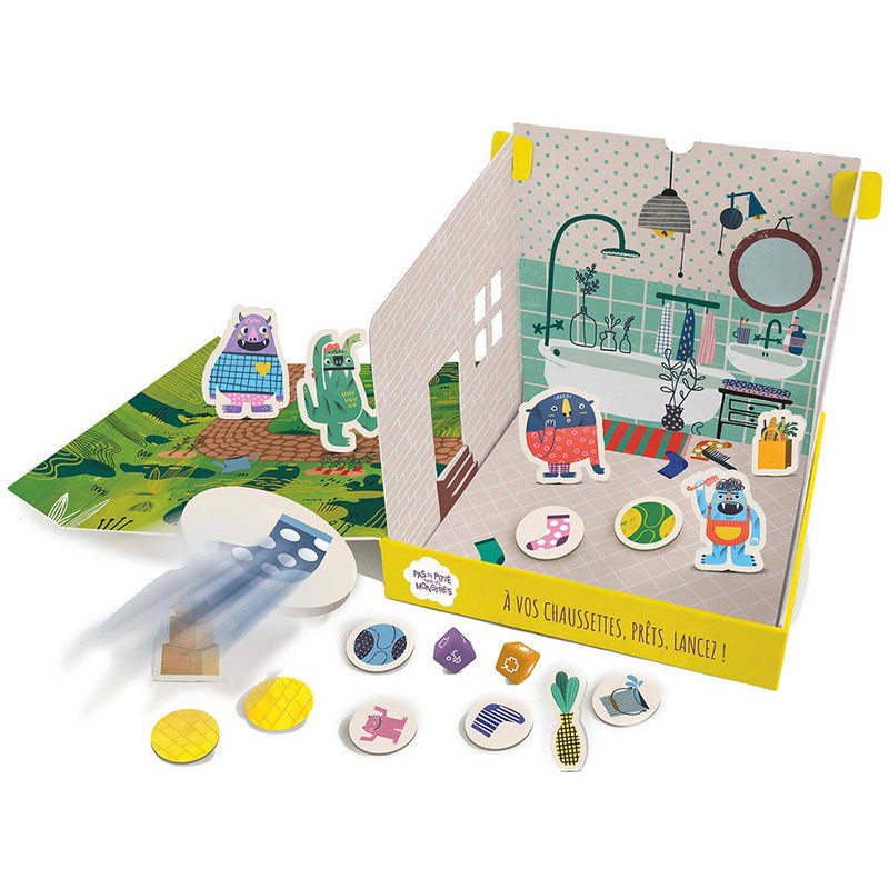Ouvre le livre, déplie les pages et construis la maison dans laquelle tu vas placer les monstres. Tu ne joues pas à Donjons et Dragons, mais pour gagner tu devras quand même combattre des monstres et les mettre à terre (littéralement). Ce concept original et les actions que les joueurs doivent faire avant de lancer leurs « armes » en font un chouette jeu d’ambiance pour les petits. A partir de 4 ans.