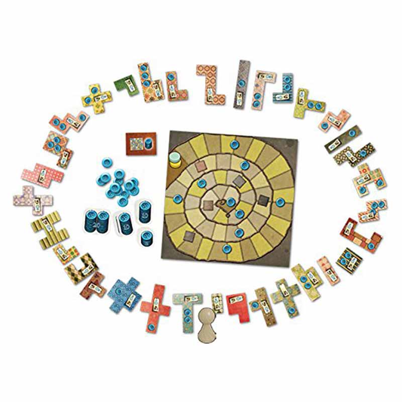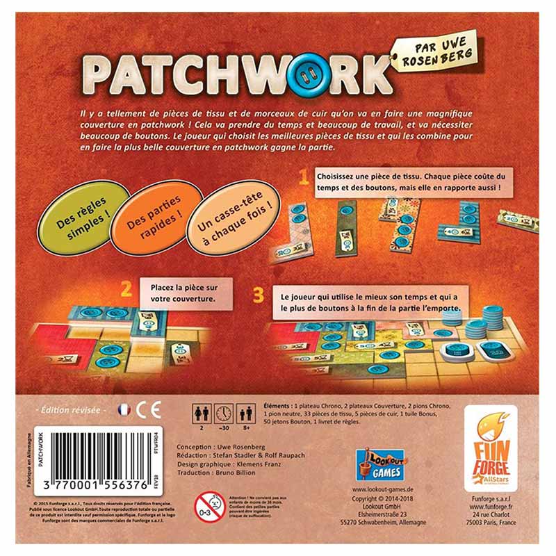 Contenu : 1 plateau Chrono, 2 plateaux Couverture, 1 pion neutre, 2 pions Chrono, 33 pièces de tissu, 5 pièces de tissu spéciales, 1 tuile spéciale bonus, 50 tuiles Bouton (32 tuiles de 1 bouton, 12 tuiles de 5 boutons, 5 tuiles de 10 boutons et 1 tuile de 20 boutons).