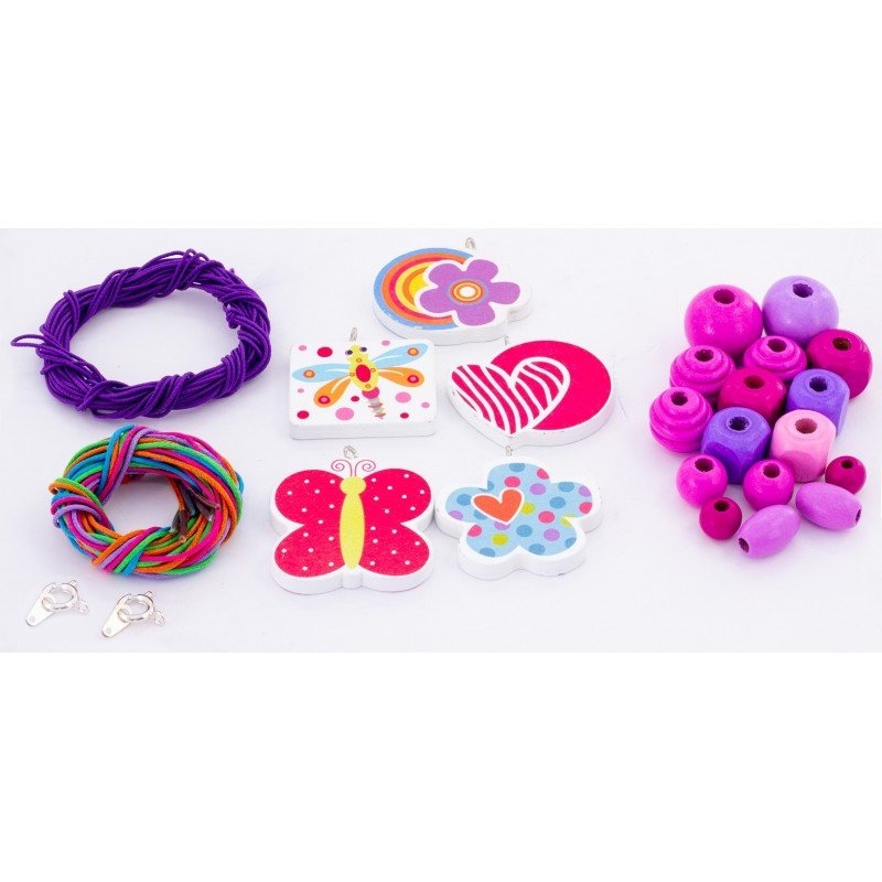Contenu : Environ 550 perles en bois, 8 coloris et 8 formes différentes, 5 breloques en bois, 1 cordon élastique de 480 cm, 5 lacets de 90 cm, 2 fermoirs en métal et un guide de création.