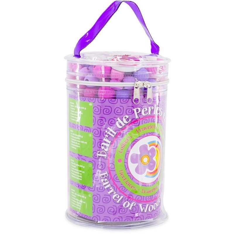 Petit baril de Perles Violettes… avec anse et fermeture éclair. Rempli d’environ 550 perles en bois de 8 coloris et 8 formes différentes. 5 breloques en bois 1 cordon élastique, 5 lacets, 2 fermoirs en métal et un guide de création.