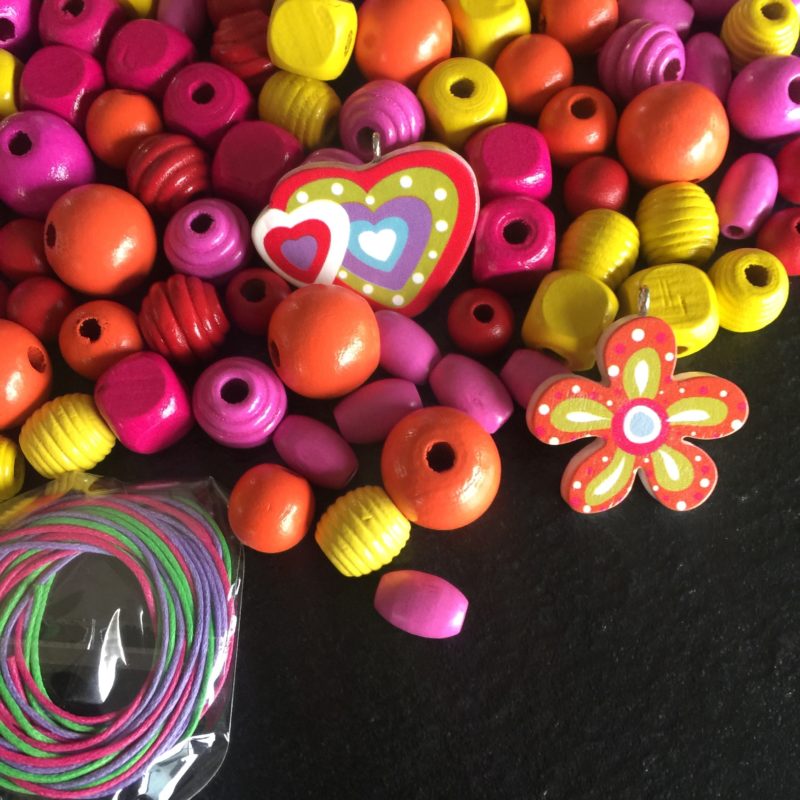 Contenu : Environ 140 perles en bois, 5 coloris et 5 formes différentes, 2 breloques, 2 lacets de 90 cm, et un guide de création.