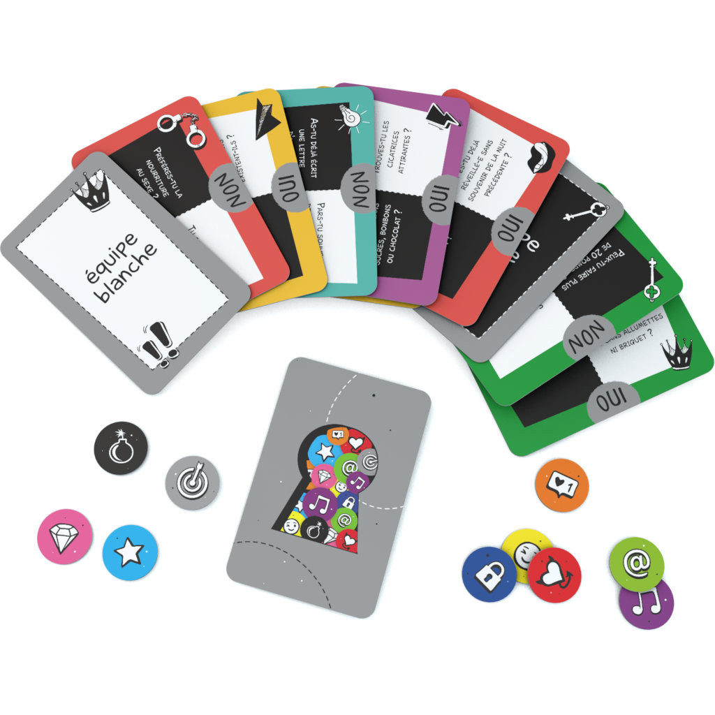 Petits secrets entre amis sépare les joueurs en deux équipes secrètes : l’équipe noire et l’équipe blanche. Sur chaque carte question, on trouvera une question destinée à l’équipe noire (possédant une carte équipe noire) et une question destinée à l’équipe blanche (possédant une carte équipe blanche). Les bords de chaque carte indiquent « oui » et « non ».